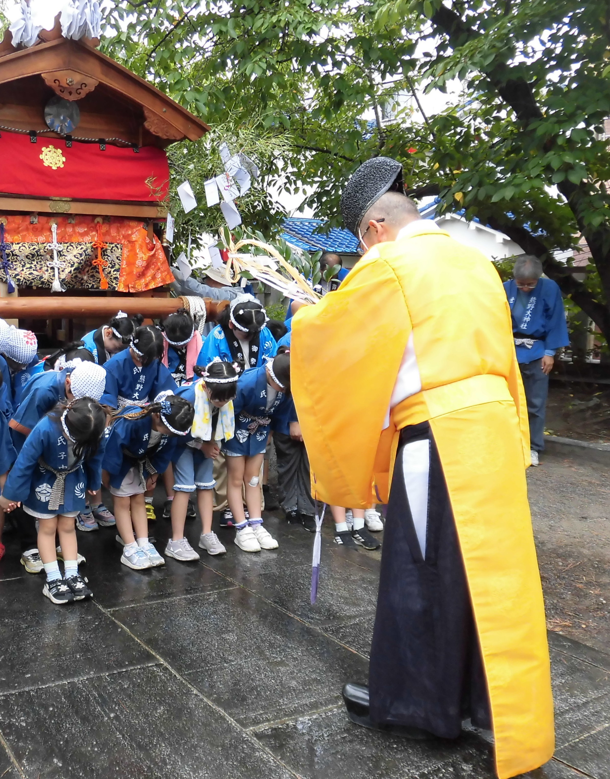 今年も地域の熊野大神社秋祭りのだんじり巡行に小学生11人が参加しました。朝から小雨が降る中でしたが、巡行前にお祓いを受けて安全を祈願していざ出発!!3年生以上の子どもたちが交代で掛け声と共に大太鼓を叩き、残る子どもたちはだんじりを引いて町内を巡行して、お祭りを盛りあげました。子どもたちは帰りにお菓子とジュースをいただいて笑顔で帰ってきました。