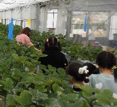 現地につくと子どもたちはちょうど肩の高さくらいにたくさんの大きなイチゴが実っていました。子どもたちはそのたくさんのイチゴを丁寧にひとつひとつ摘み、もぎたての美味しいイチゴを味わっていました。