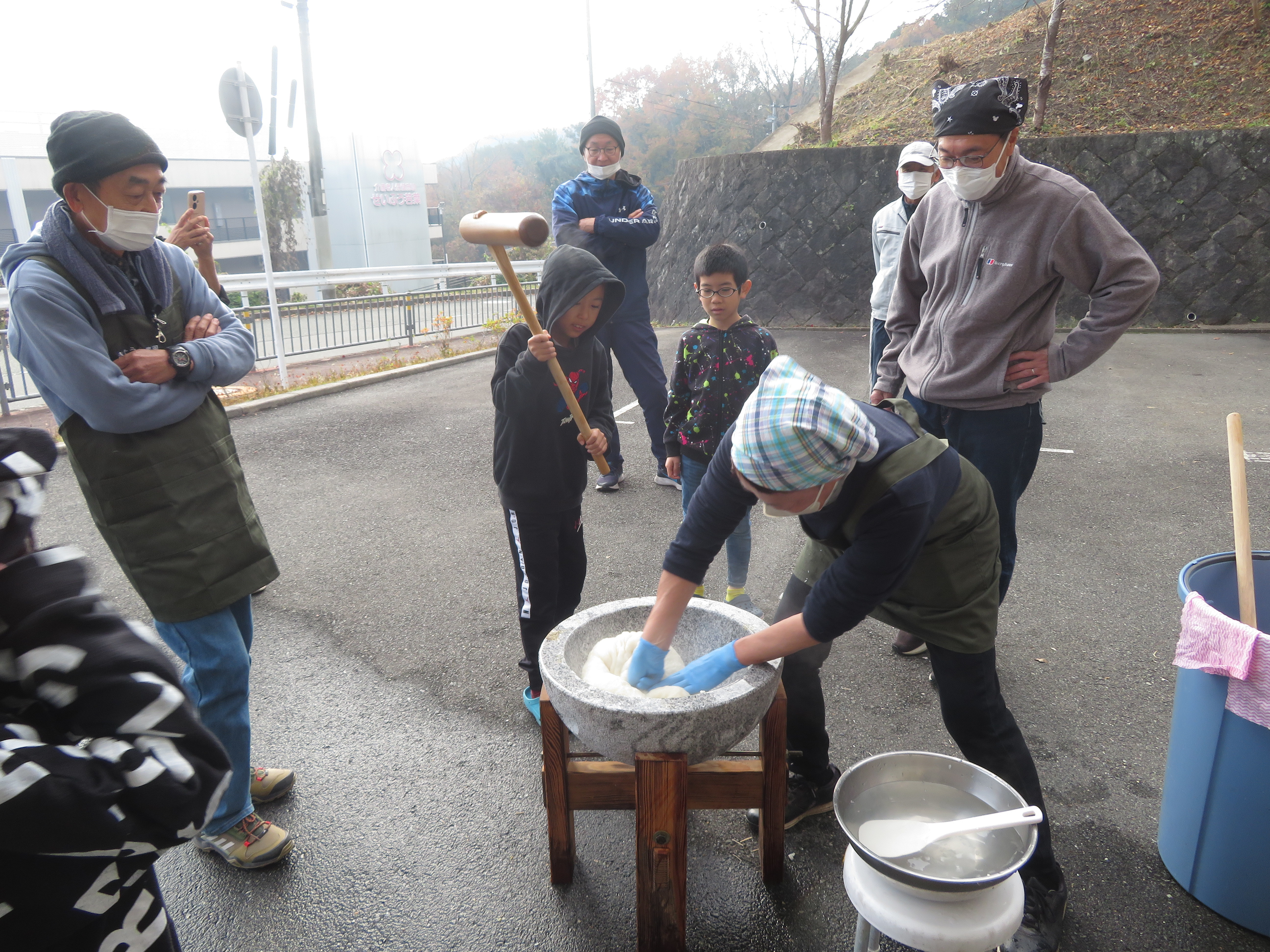 今年も、きたうえ農園の関係者の皆さんが、子ども達の為に来てくださり、お餅つきをしました。きたうえ農園さんからいただいたモチ米約21㎏をみんなで力を合わせてつきました。あんこ、きな粉、大根おろし、砂糖醤油、エビのつきたてのおもちをお腹いっぱいになるまで食べました。子ども達も大満足でした。