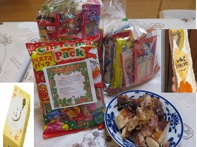 「クリスマス」にとたくさんの寄贈を子ども達に頂きました。いながわサンタさんといつもお世話になっている「たのうえこどもクリニック」の田上先生、そして株式会社サンヨー様からお菓子の詰め合わせを頂き、小鯛竜也プロから月化粧、春山組の春山様からローストチキン、いちごICHIJU様からフルーツサンド等皆様からのたくさんのご寄贈に子ども達のクリスマスがより良いものとなりました。ありがとうございました。