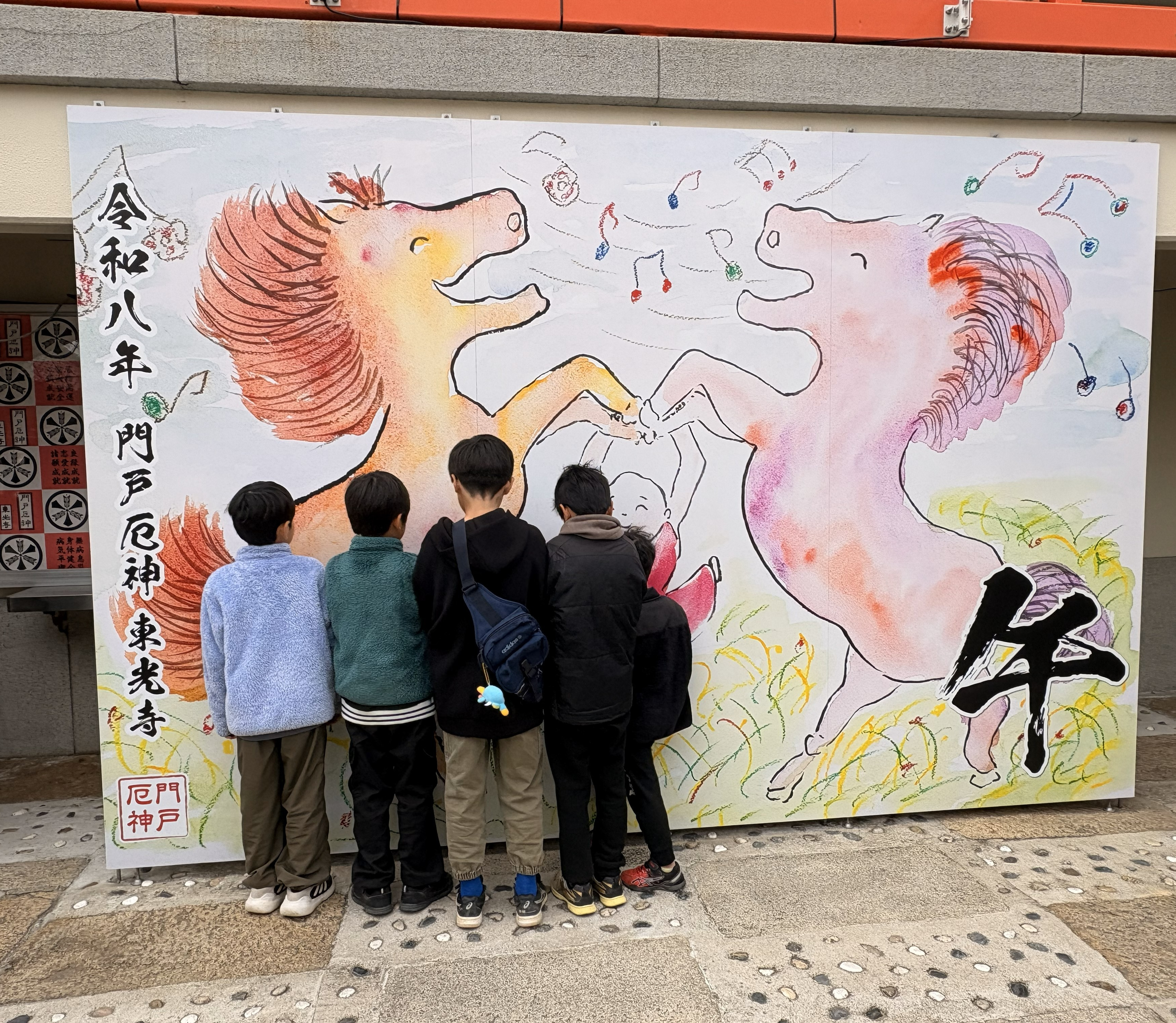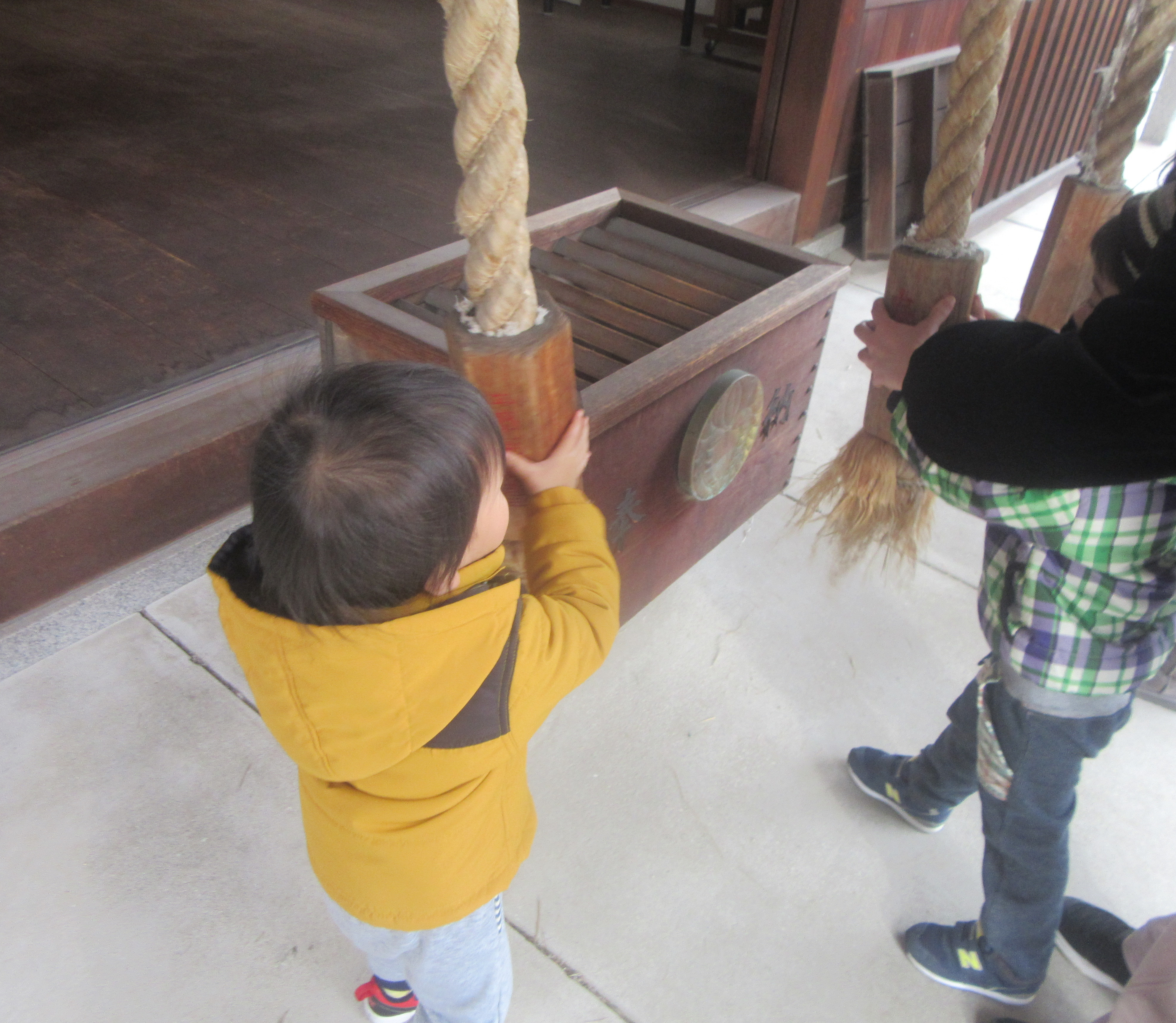 したあと、幼児さんたちは子供の家の近所にある神社へ、男の子と女の子たちはそれぞれ日をわけて西宮にある門戸厄神に行ってきました。子どもたちは握りしめた小銭を賽銭箱に投げ入れて手を合わせて各々願いごとをしました。今年1年みんなが健康で楽しく過ごせますように~。
